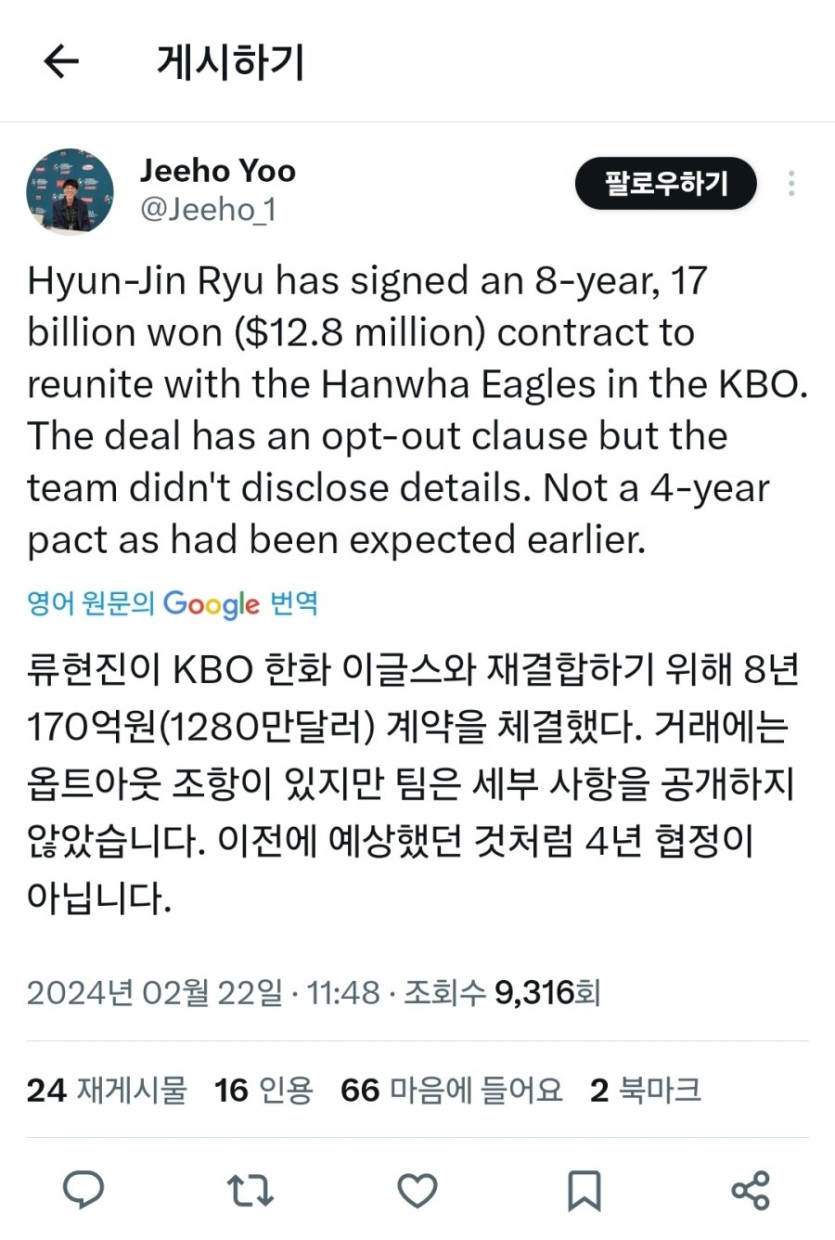야구] 류현진 한화와 8년계약 이동 이동님의 홈 전체게시물 아이디로 검색 이동님의 홈 전체게시물 아이디로 검색 2024-02-22 14:01 352 1 - 첨부파일 : 2.jpg (155.7K) - 다운로드 0 2024-02-22 14:01:08 이전글 다음글 목록 답변 글쓰기 본문 와..싸다 싸 댓글목록1 퍼뜩퍼뜩님의 댓글 퍼뜩퍼뜩 퍼뜩퍼뜩님의 홈 전체게시물 아이디로 검색 퍼뜩퍼뜩님의 홈 전체게시물 아이디로 검색 2024-02-22 17:56 그래도 낭만있네요 류현진선수 댓글쓰기 그래도 낭만있네요 류현진선수 댓글쓰기 댓글 포인트 안내 이름 필수 비밀번호 필수 비밀글 사용 첨부파일 동영상 이모티콘 적용하기 * 지원 동영상 서비스 목록 보기 지원 동영상 서비스 목록 서비스명URL 주소 유튜브https://www.youtube.com 비메오https://vimeo.com 네이버 TVhttp://tv.naver.com 카카오 TVhttps://tv.kakao.com 테드https://www.ted.com 판도라http://www.pandora.tv 데일리모션https://www.dailymotion.com 슬라이더쉐어https://www.slideshare.net 유쿠http://www.youku.com iQiyihttp://www.iqiyi.com 자동등록방지 자동등록방지 숫자음성듣기 새로고침 자동등록방지 숫자를 순서대로 입력하세요. 댓글등록 댓글 포인트 안내