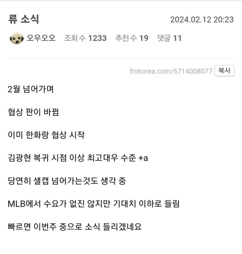 야구] 류현진 한화복귀함?? 대희 대희님의 홈 전체게시물 아이디로 검색 대희님의 홈 전체게시물 아이디로 검색 2024-02-19 13:57 341 1 - 첨부파일 : 1.jpg (27.8K) - 다운로드 0 2024-02-19 13:57:58 - 첨부파일 : 2.jpg (55.0K) - 다운로드 0 2024-02-19 13:57:58 이전글 다음글 검색 목록 답변 글쓰기 본문 진짜임?.. 출처 mlb파크 댓글목록1 도레미님의 댓글 도레미 도레미님의 홈 전체게시물 아이디로 검색 도레미님의 홈 전체게시물 아이디로 검색 2024-02-19 14:36 진짠가요? 기사는 복귀임박이긴한데 역대최고연봉..!? 댓글쓰기 진짠가요? 기사는 복귀임박이긴한데 역대최고연봉..!? 댓글쓰기 댓글 포인트 안내 이름 필수 비밀번호 필수 비밀글 사용 첨부파일 동영상 이모티콘 적용하기 * 지원 동영상 서비스 목록 보기 지원 동영상 서비스 목록 서비스명URL 주소 유튜브https://www.youtube.com 비메오https://vimeo.com 네이버 TVhttp://tv.naver.com 카카오 TVhttps://tv.kakao.com 테드https://www.ted.com 판도라http://www.pandora.tv 데일리모션https://www.dailymotion.com 슬라이더쉐어https://www.slideshare.net 유쿠http://www.youku.com iQiyihttp://www.iqiyi.com 자동등록방지 자동등록방지 숫자음성듣기 새로고침 자동등록방지 숫자를 순서대로 입력하세요. 댓글등록 댓글 포인트 안내